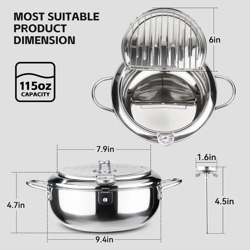 Elevate your kitchen game with our Japanese-style Tempura Deep Fryer Pot. Crafted from premium 304 food-grade stainless steel, this durable fryer offers superior heat retention and distribution, ensuring your French fries, chicken wings, and tempura come out perfectly crispy every time.